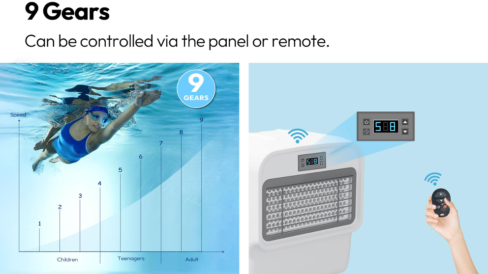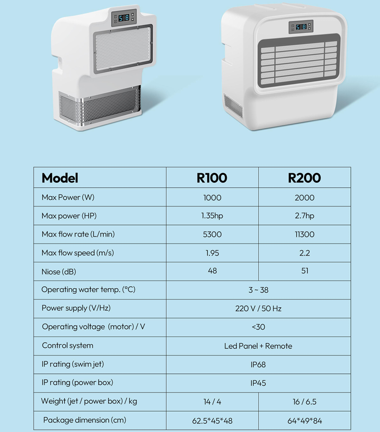 Designed for high-intensity training and professional-grade resistance. For those who need maximum power, the R200 delivers. With a massive 2000W output, this model produces a flow rate of 11300 L/min—more than double the R100—to challenge even the strongest swimmers. Maximum Thrust: 2.7 hp motor capable of reaching flow speeds of 2.2 m/s. High-Volume Flow: Engineered for professional-grade resistance and deep-water training. Heavy-Duty Build: Reinforced 16kg jet unit built to handle high-velocity water movement. Seamless Control: Instantly adjust your workout intensity via the included remote or LED interface.